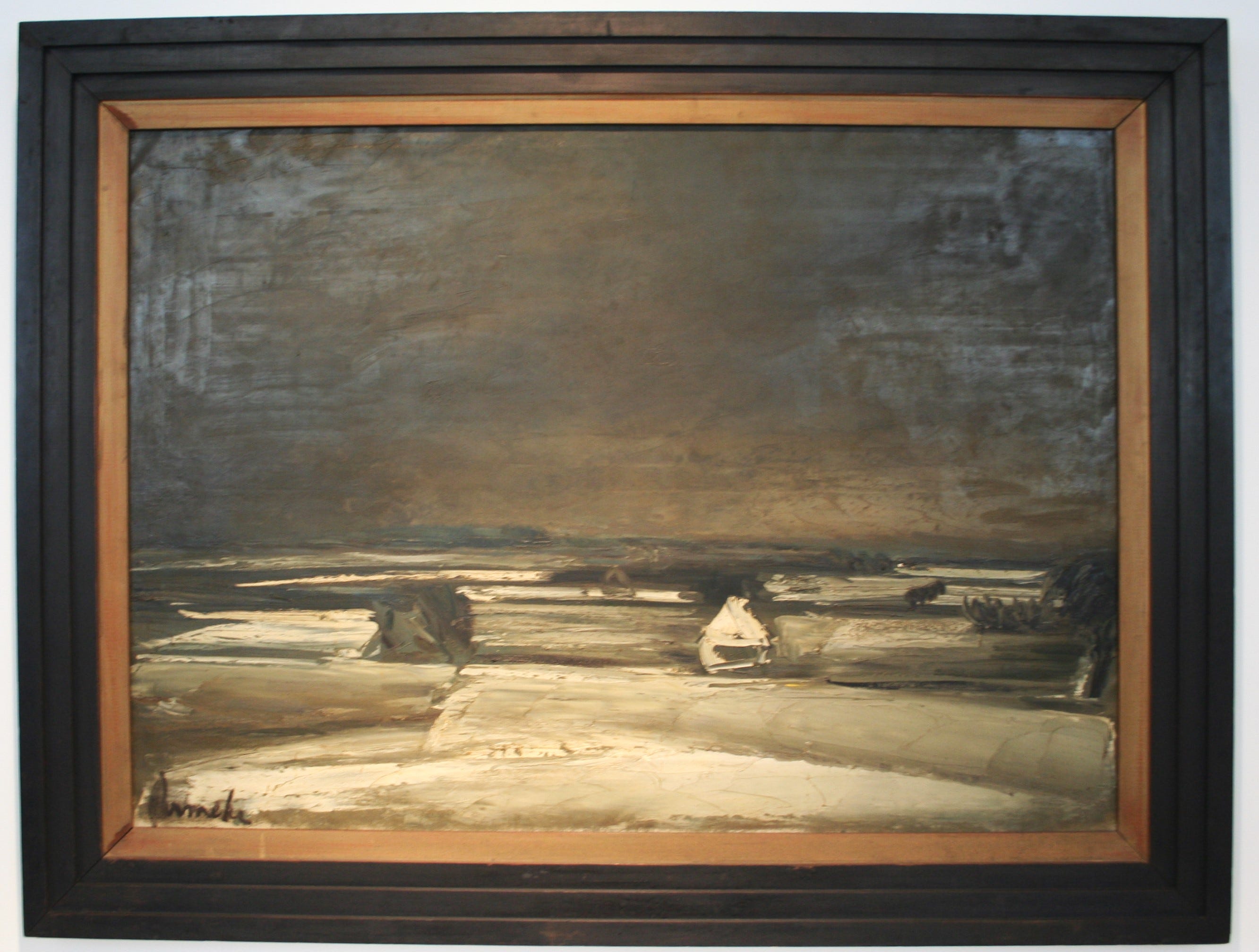 It is not solid black; it is dim and speckled like a twilight mountain view in heavy fog. It is not so different to the dark clouds and skies one finds in the background of paintings, such as Romantic landscapes and Renaissance paintings of holy beings in skies. Hanging nearby is stygian snow landscape by Constant Permeke, a Flemish Expressionist of an older generation than Verheyen.
